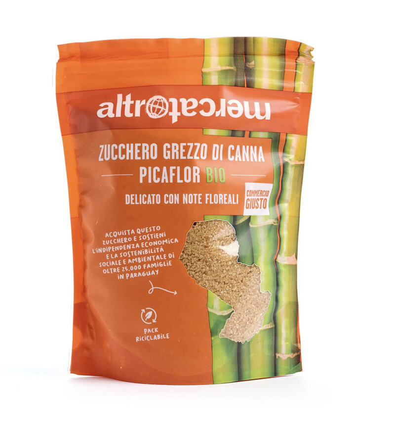 Zucchero grezzo di canna proveniente dal Paraguay, ottenuto attraverso un processo di centrifugazione. Da agricoltura biologica. Pacco da gr. 500